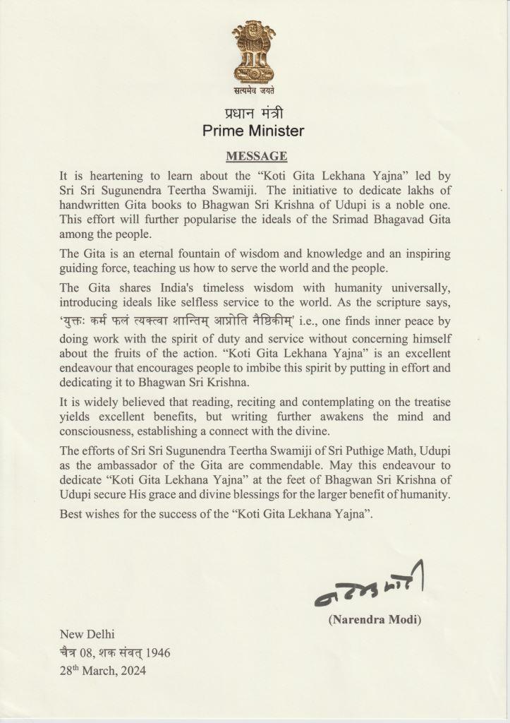 The worship of the Supreme Lord should not be limited to routine pooja and services but create spiritual awareness within us and give peace of mind. Bhagavad Gita is the source book of all spirituality. This is not a sectarian book; it is a book that gives wisdom to mankind. It is a torch for difficult path of our lives. "Koti Gita Lekhana Yajna" is a sacred project with the determination to reach Gita book to maximum number of homes.